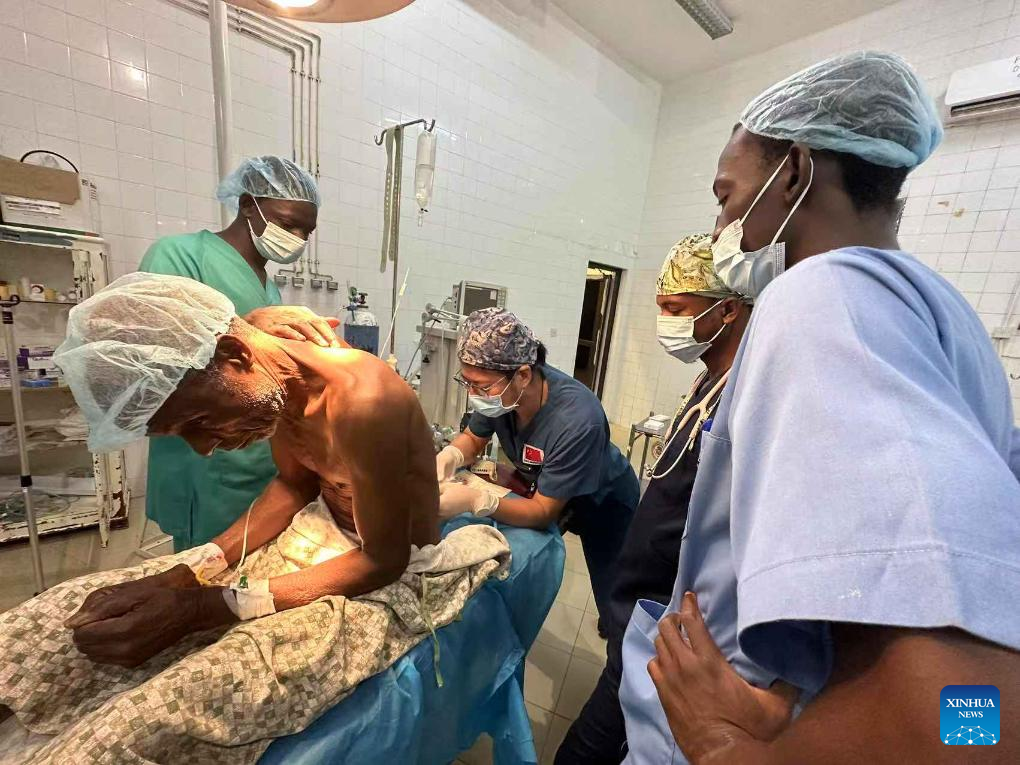 A member of the 22nd batch of the Chinese medical team in The Gambia performs anesthesia on a patient at the Farafenni General Hospital in the North Bank Division, The Gambia, April 10, 2025. The 22nd batch of the Chinese medical team in The Gambia conducted an outreach clinic and medical supplies donation event at the Farafenni General Hospital in the North Bank Division on Friday. The event, which began on April 7, covered multiple specialties including gynecology, pediatric surgery, orthopedic trauma, and traditional Chinese medicine. A total of 21 surgeries, mainly general and pediatric, were performed, and over 300 patients received treatment and consultations. (The 22nd batch of the Chinese medical team in The Gambia/Handout via Xinhua)