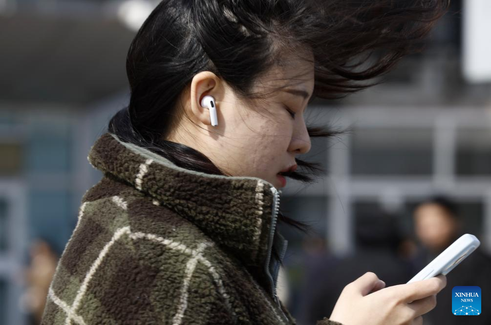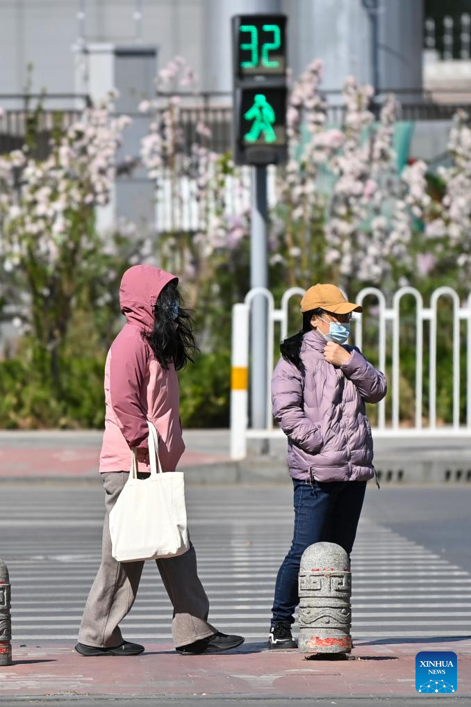 People walk on a street in Beijing, capital of China, April 12, 2025. Many parts in northern China are experiencing gale-force winds and temperature drops on Saturday. (Xinhua/Jiang Han)