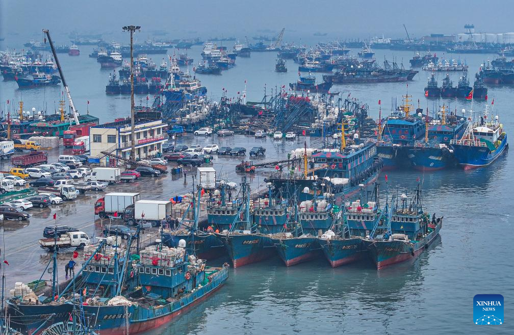 An aerial drone photo taken on April 12, 2025 shows fishing ships harboring at a port to shelter from strong gales in Rongcheng, east China's Shandong Province. Many parts in northern China are experiencing gale-force winds and temperature drops on Saturday. (Photo by Li Xinjun/Xinhua)