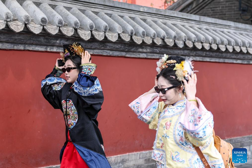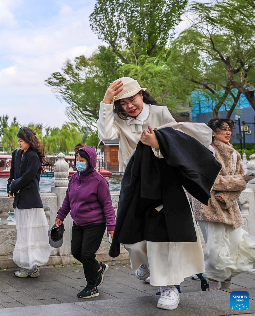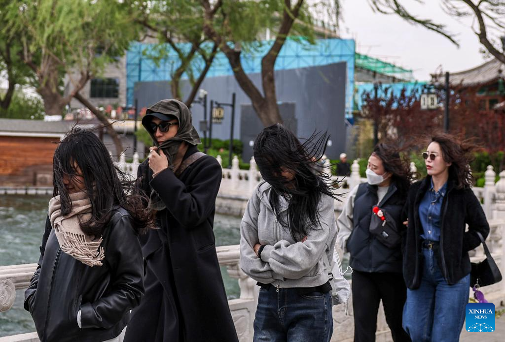 People walk at Shichahai scenic area in Beijing, capital of China, April 12, 2025. Many parts in northern China are experiencing gale-force winds and temperature drops on Saturday. (Xinhua/Jiang Han)