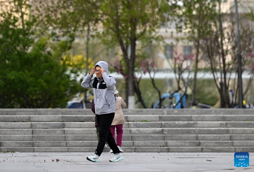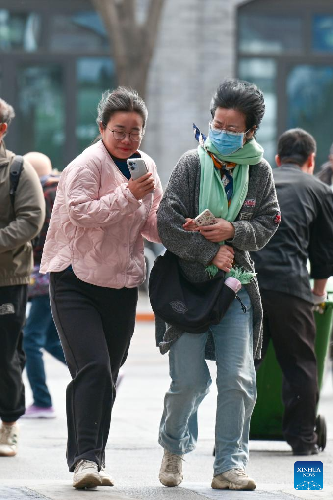 People walk on a street in Beijing, capital of China, April 12, 2025. Many parts in northern China are experiencing gale-force winds and temperature drops on Saturday. (Xinhua/Li Xin)