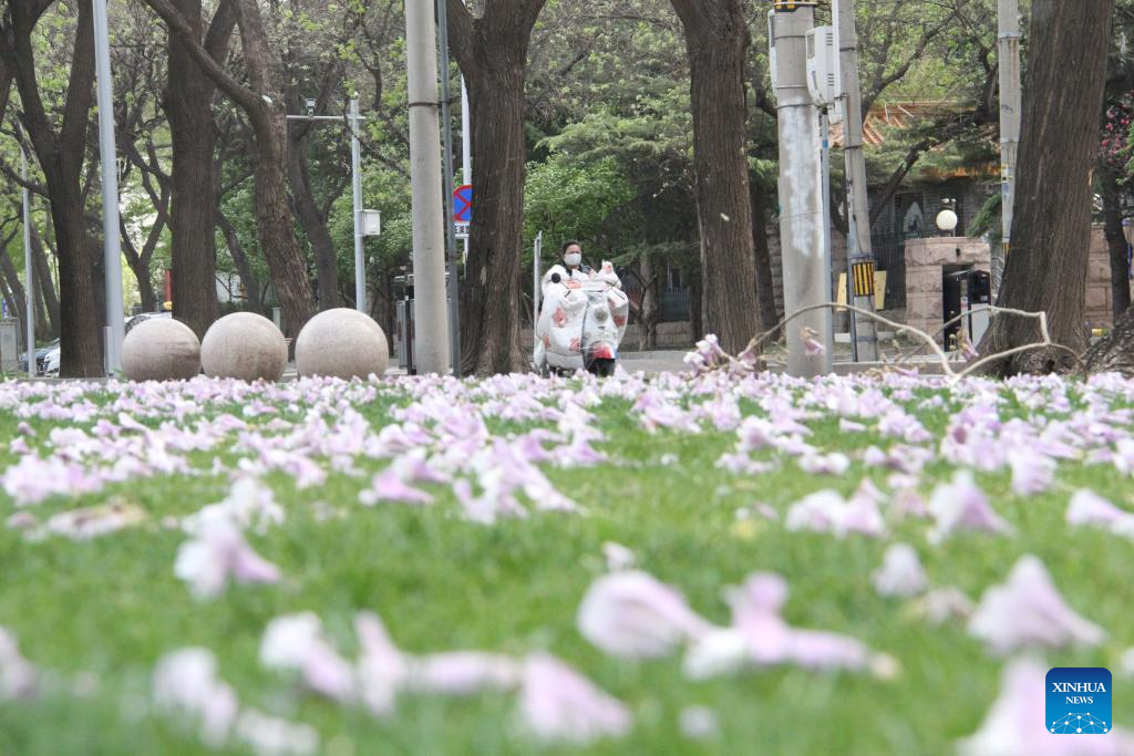 A citizen rides in strong wind as fallen flowers scatter on the grass, in Beijing, capital of China, April 12, 2025. Many parts in northern China are experiencing gale-force winds and temperature drops on Saturday. (Xinhua/Liu Hongxia)