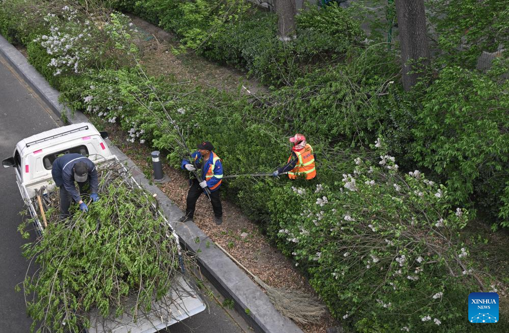 Workers clear fallen branches blown down by strong winds in Beijing, capital of China, April 12, 2025. Many parts in northern China are experiencing gale-force winds and temperature drops on Saturday. (Xinhua/Jin Liangkuai)