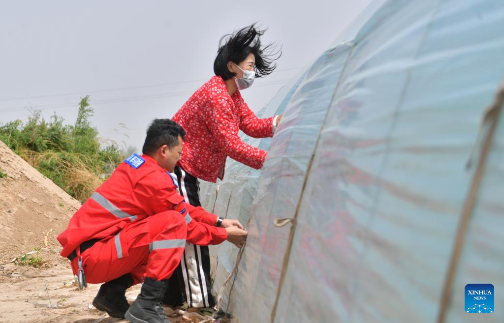 A volunteer (L) helps a farmer reinforce a watermelon greenhouse in Sanxingzhuang Village of Shangqiu, central China's Henan Province, April 12, 2025. Many parts in northern China are experiencing gale-force winds and temperature drops on Saturday. (Photo by Miao Yucai/Xinhua)