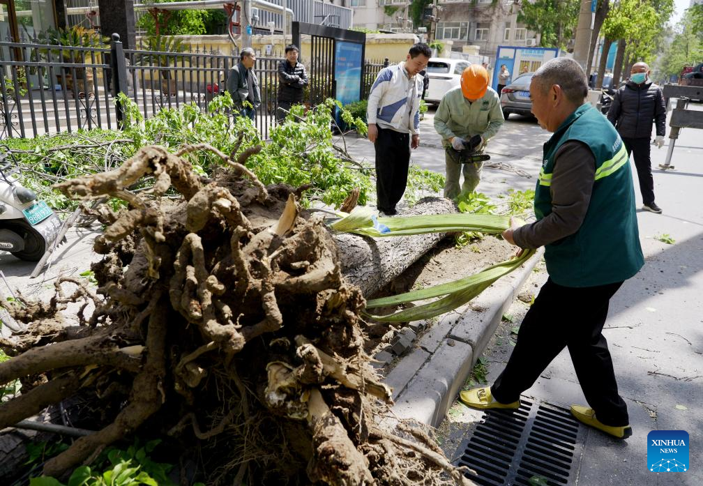 Staff members work to clear fallen trees uprooted by strong winds in Zhengzhou, central China's Henan Province, April 12, 2025. Many parts in northern China are experiencing gale-force winds and temperature drops on Saturday. (Xinhua/Li Jianan)