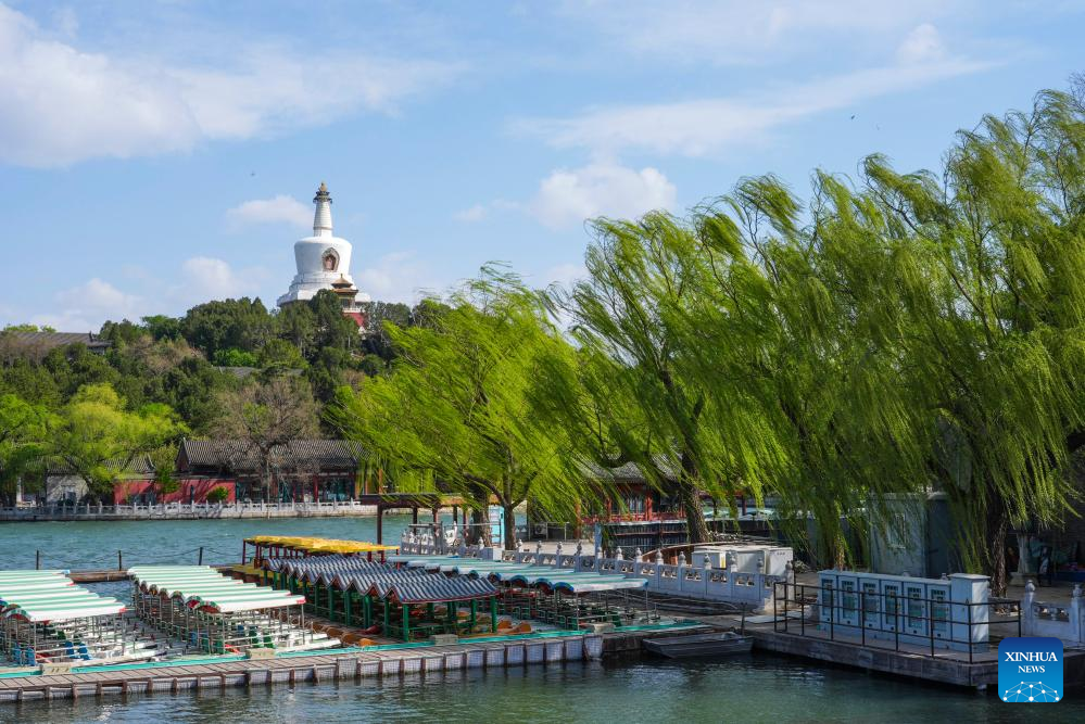 Sightseeing boats are temporarily suspended due to strong winds at Beihai Park in Beijing, capital of China, April 12, 2025. Many parts in northern China are experiencing gale-force winds and temperature drops on Saturday. (Xinhua/Chen Yehua)