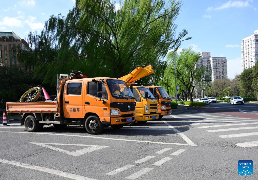 Municipal emergency vehicles stand ready to respond to potential impacts from strong winds in Beijing, capital of China, April 12, 2025. Many parts in northern China are experiencing gale-force winds and temperature drops on Saturday. (Xinhua/Li He)