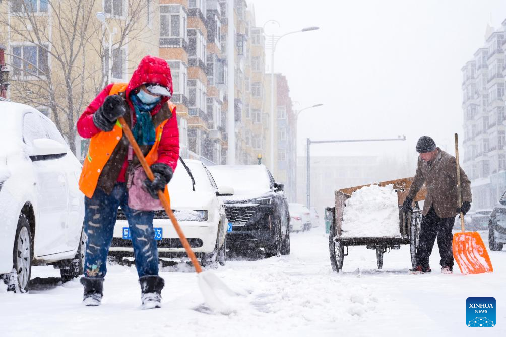 Sanitation workers clean snow in the Greater Khingan Range, northeast China's Heilongjiang Province, April 12, 2025. Many parts in northern China are experiencing gale-force winds and temperature drops on Saturday. (Photo by Cheng Hongchun/Xinhua)