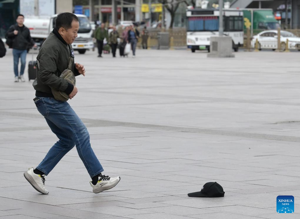 A traveler chases after his hat blown away by strong winds on the square in front of Beijing Railway Station in Beijing, capital of China, April 12, 2025. Many parts in northern China are experiencing gale-force winds and temperature drops on Saturday. (Xinhua/Li He)