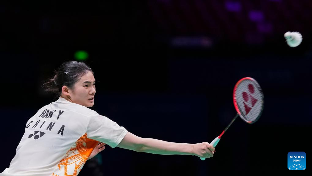 Gao Fangjie of China hits a return during the women's singles semifinal match against Han Yue of China at Badminton Asia Championships 2025 in Ningbo, east China's Zhejiang Province, April 12, 2025. (Xinhua/Sun Fei)