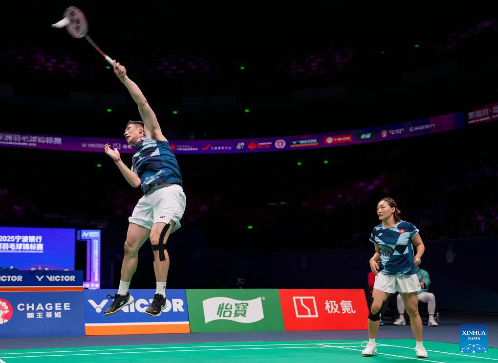 Jiang Zhenbang (L)/Wei Yaxin of China compete during the mixed doubles semifinal match against Tang Chun Man/Tse Ying Suet of China's Hong Kong at Badminton Asia Championships 2025 in Ningbo, east China's Zhejiang Province, April 12, 2025. (Xinhua/Sun Fei)
