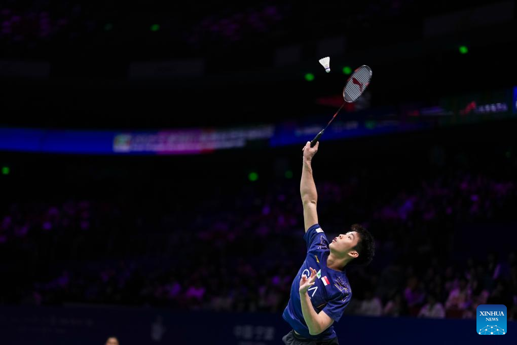 Kunlavut Vitidsarn of Thailand hits a return during the men's singles semifinal against Loh Kean Yew of Singapore at Badminton Asia Championships 2025 in Ningbo, east China's Zhejiang Province, April 12, 2025. (Xinhua/Sun Fei)