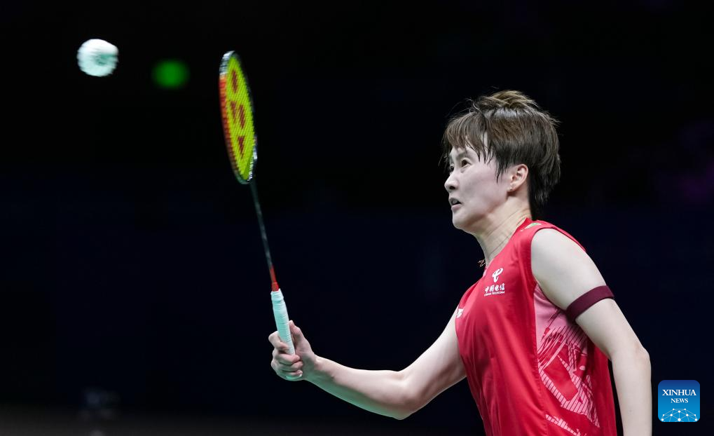 Chen Yufei of China reacts during the women's singles semifinal against Sim Yu Jin of South Korea at Badminton Asia Championships 2025 in Ningbo, east China's Zhejiang Province, April 12, 2025. (Xinhua/Sun Fei)