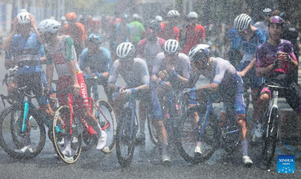 Cyclists cool down in mist after Stage 5 at the 16th Tour of Hainan cycling race from Dongfang to Sanya, south China's Hainan Province, April 11, 2025. (Xinhua/Yang Guanyu)