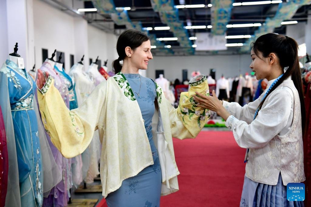 A Russian guest (L) tries Hanfu at a Hanfu base in Caoxian County, east China's Shandong Province, April 8, 2025.