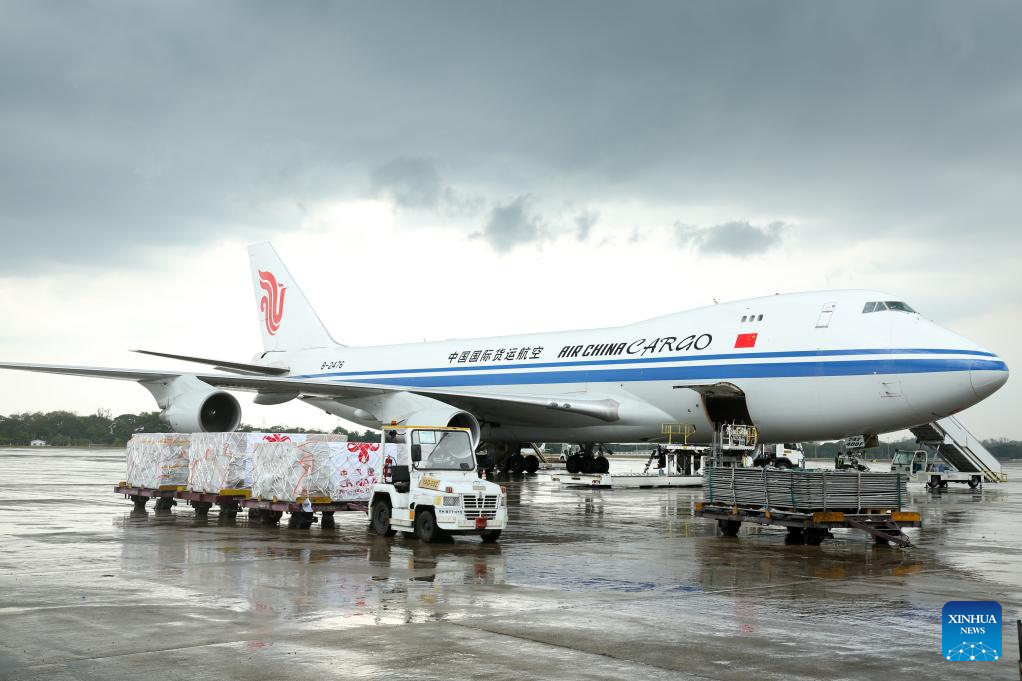 The sixth batch of emergency humanitarian aid dispatched by the Chinese government arrives at Yangon International Airport in Myanmar on April 11, 2025. The aid supplies include 26 tents, 2,000 sets of single-person outdoor cooking equipment, 10,000 solar lamps, 38,880 bars of soap, 38,880 bottles of shower gel, 38,880 bottles of shampoo, 38,880 tubes of toothpaste, 38,880 sets of toothbrushes, and 38,880 bags of laundry detergent, with a total weight of over 91 tons. (Xinhua/Myo Kyaw Soe)