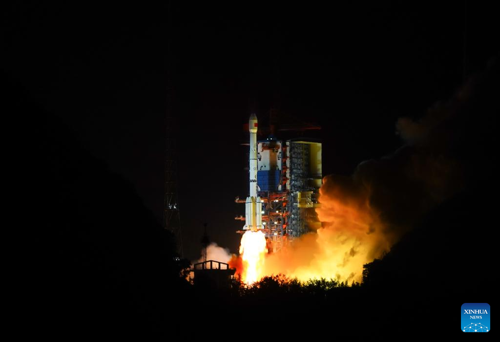A Long March-3B rocket carrying a new communication technology test satellite blasts off from the Xichang Satellite Launch Center in southwest China's Sichuan Province, April 11, 2025. China sent a new communication technology test satellite into the planned orbit early on Friday.