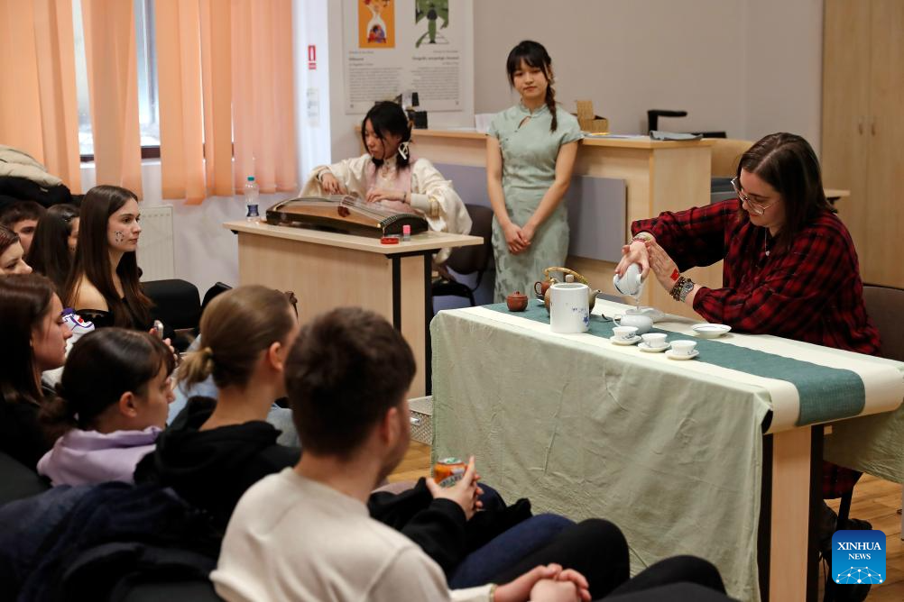 Students watch a Chinese tea art demonstration during an event marking the International Chinese Language Day in Sibiu, Romania, on April 11, 2025. The Confucius Institute at Lucian Blaga University of Sibiu held a vibrant celebration on Friday to mark the 2025 International Chinese Language Day, attracting more than 100 students from the university and local high schools. (Photo by Cristian Cristel/Xinhua)