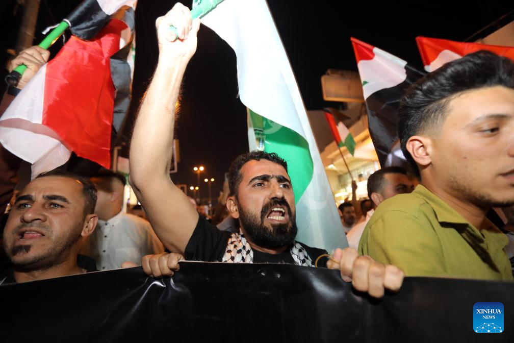 People holding banners and flags attend a rally to support Palestinians in Baghdad, Iraq, April 11, 2025. (Xinhua/Khalil Dawood)