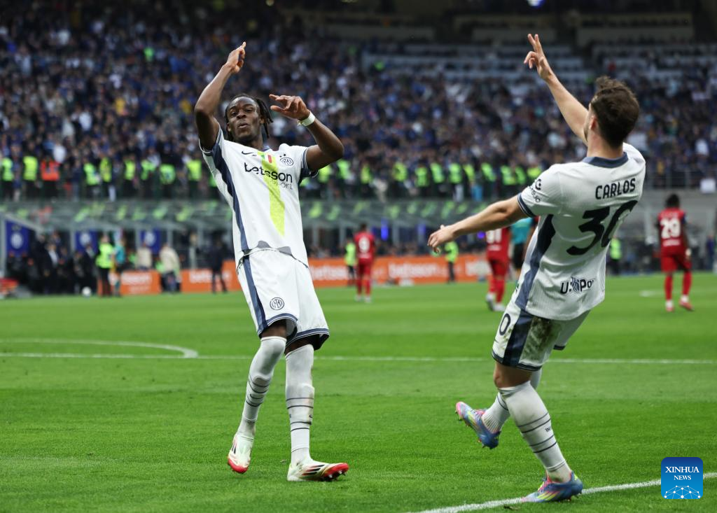 Inter Milan's Yann Bisseck (L) celebrates his goal with his teammates Carlos Augusto during a Serie A football match between Inter Milan and Cagliari in Milan, Italy, April 12, 2025. (Xinhua/Li Jing)