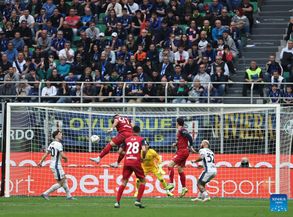 Cagliari's Roberto Piccoli (2nd L) heads for the ball to score during a Serie A football match between Inter Milan and Cagliari in Milan, Italy, April 12, 2025. (Xinhua/Li Jing)