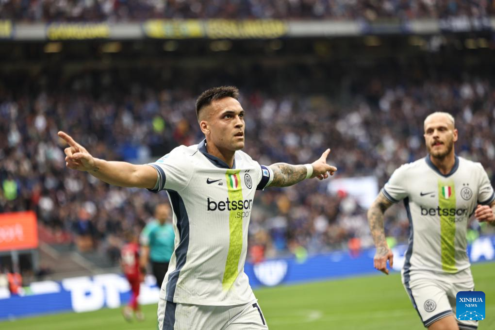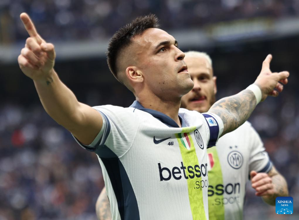 Inter Milan's Lautaro Martinez celebrates his goal during a Serie A football match between Inter Milan and Cagliari in Milan, Italy, April 12, 2025. (Xinhua/Li Jing)