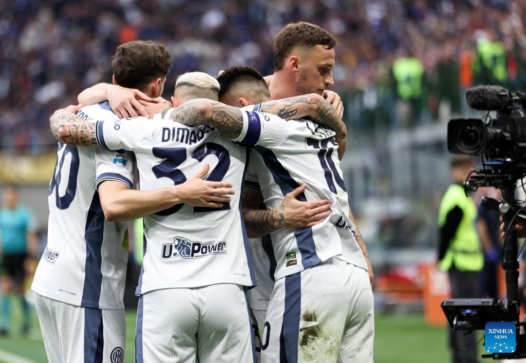 Lautaro Martinez (2nd R) of Inter Milan celebrates his goal with teammates during a Serie A football match between Inter Milan and Cagliari in Milan, Italy, April 12, 2025. (Xinhua/Li Jing)