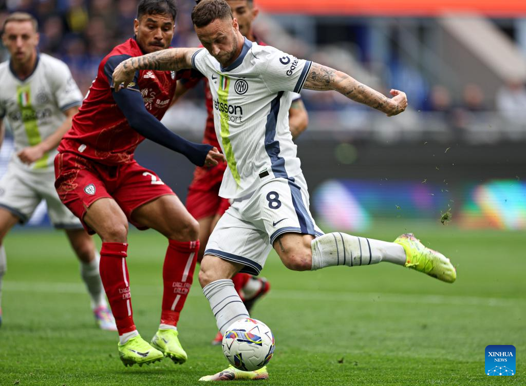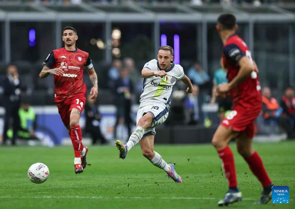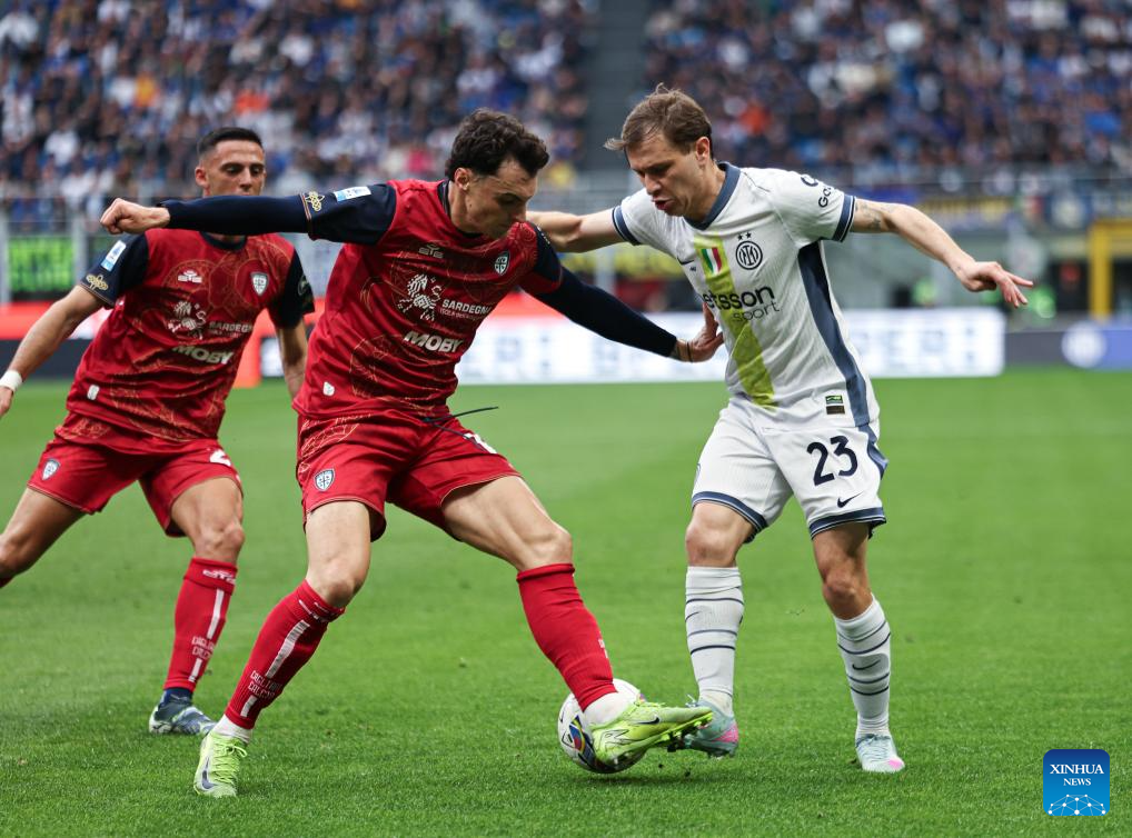 Inter Milan's Nicolo Barella (R) vies with Cagliari's Nadir Zortea (C) during a Serie A football match between Inter Milan and Cagliari in Milan, Italy, April 12, 2025. (Xinhua/Li Jing)