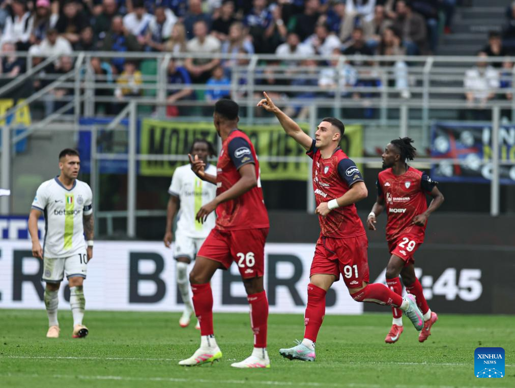 Cagliari's Roberto Piccoli (2nd R) celebrates his goal during a Serie A football match between Inter Milan and Cagliari in Milan, Italy, April 12, 2025. (Xinhua/Li Jing)
