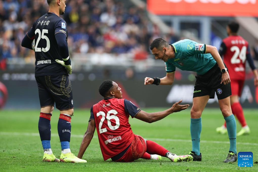 Cagliari's Yerry Mina (C) talks with the referee during a Serie A football match between Inter Milan and Cagliari in Milan, Italy, April 12, 2025. (Xinhua/Li Jing)