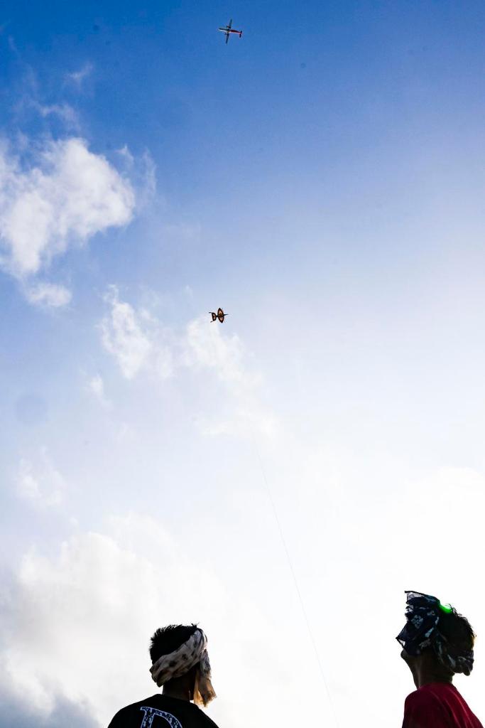 A plane flies by as Mohd Azeimi Muhd Noor (R) and his son Denie Danial bin Muhd Azeimi look at their kite in Kota Bharu in Kelantan, Malaysia, on March 28, 2025.