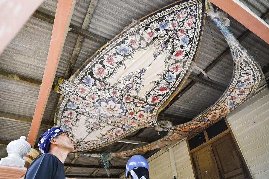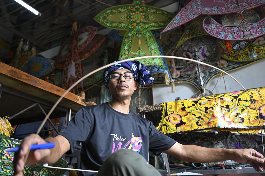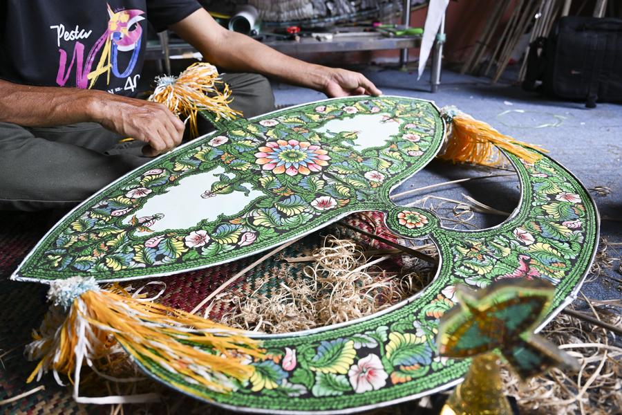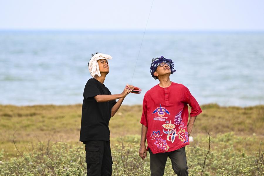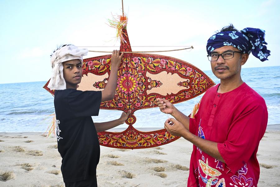 KELANTAN, April 13 (Xinhua) -- On a Kelantan beach in the afternoon, the dry monsoon wind sweeps across the fine sand under a crystal-clear sky. Forty-nine-year-old Malay artisan Mohd Azeimi Muhd Noor gently tugs the string in his hand, sending a vibrant moon kite (Wau Bulan in Malay) soaring into the azure expanse, tracing graceful arcs against the heavens. His eyes follow the kite, sparkling with childlike delight.