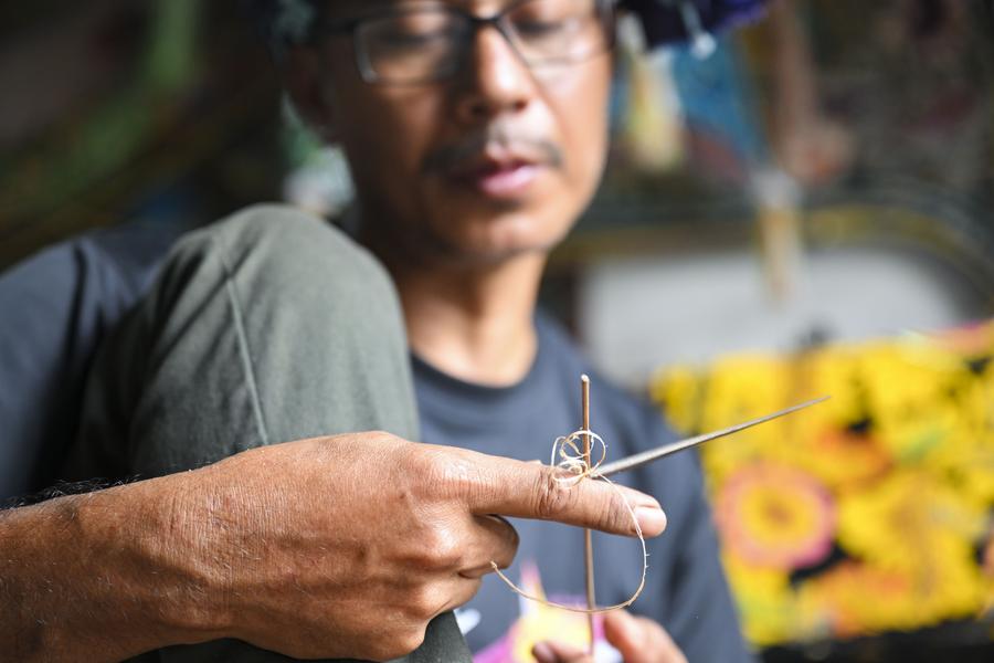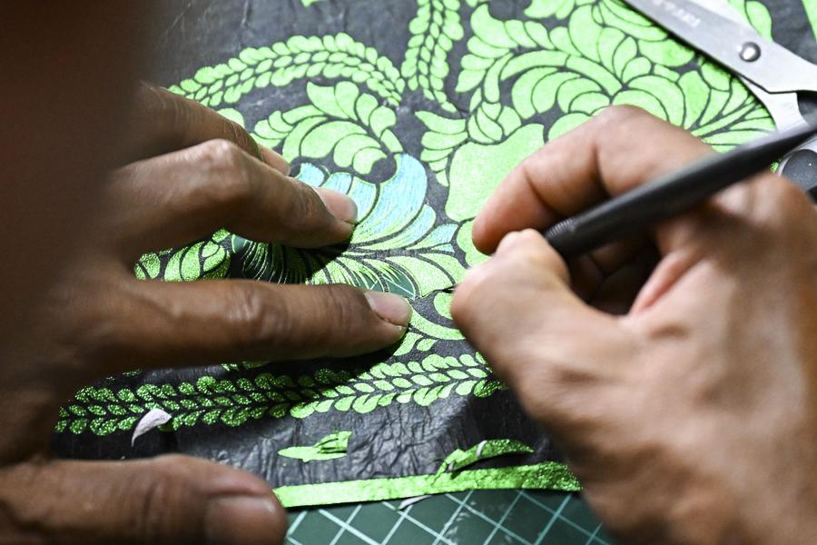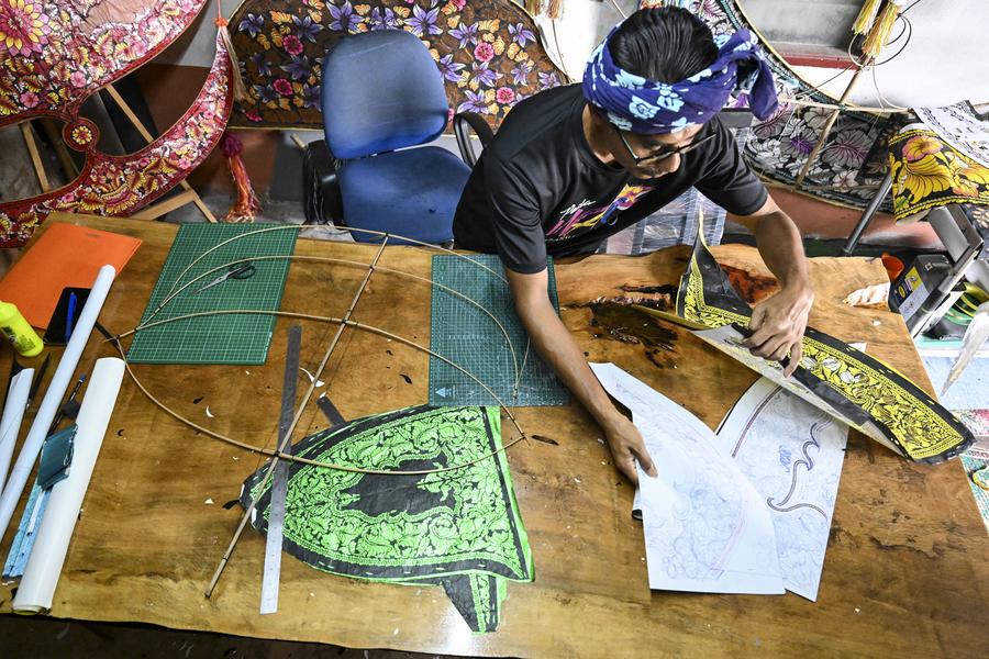 Azeimi Muhd Noor arranges his workbench at his workshop in a village near Kota Bharu, Kelantan, Malaysia, on March 27, 2025.Azeimi Muhd Noor decorates a kite at his workshop in a village near Kota Bharu, Kelantan, Malaysia, on March 27, 2025.Azeimi Muhd Noor displays a newly-made kite that takes him month-long effort at his workshop in a village near Kota Bharu, Kelantan, Malaysia, on March 27, 2025.This photo taken on March 27, 2025 shows decorations of a kite made by Azeimi Muhd Noor at his workshop in a village near Kota Bharu, Kelantan, Malaysia.This photo taken on March 27, 2025 shows a plastic bucket filled with used carving blades at the workshop of Azeimi Muhd Noor in a village near Kota Bharu, Kelantan, Malaysia.