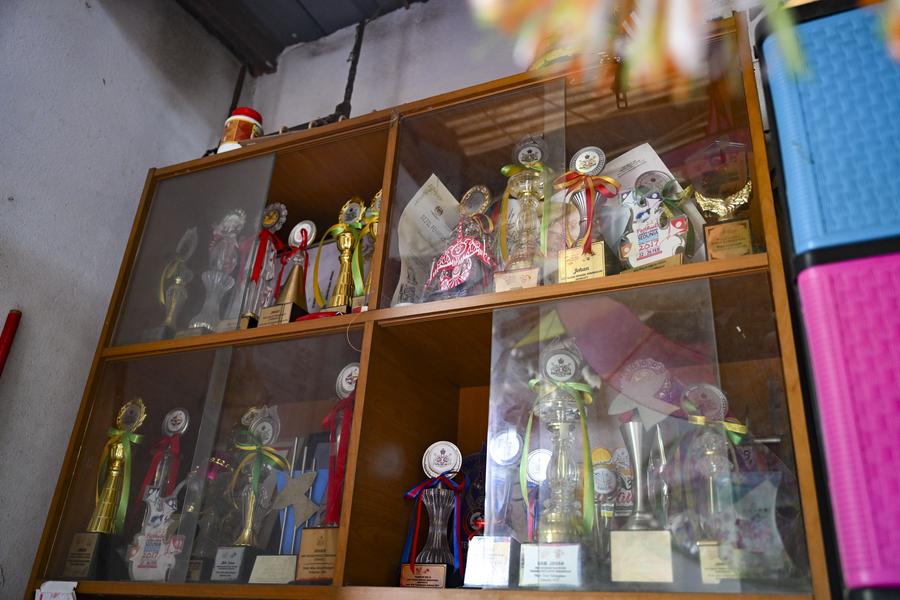 This photo taken on March 27, 2025 shows trophies marking achievements of Azeimi Muhd Noor at multiple international kite competitions as Malaysia's representative at his workshop in a village near Kota Bharu, Kelantan, Malaysia.