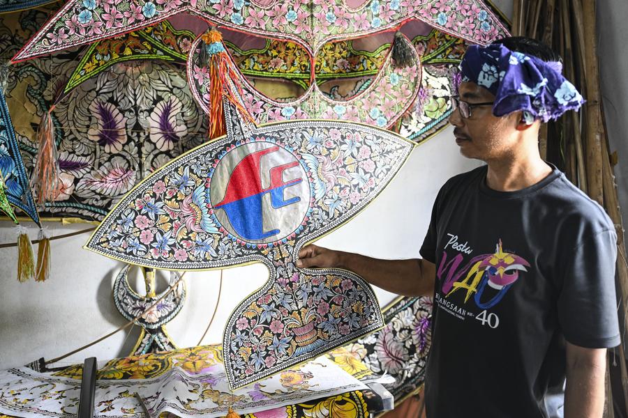 This photo taken on March 28, 2025 shows a moon kite flying in the sky over a mural depicting a local village in old days in Kota Bharu, Kelantan State, Malaysia.This photo taken on March 28, 2025 shows a mural on Kota Bharu's vibrant art street depicting Azeimi Muhd Noor crafting a traditional moon kite in Kelantan State, Malaysia.A bus adorned with a moon kite design is seen in Kota Bharu, Kelantan of Malaysia on March 28, 2025.This photo taken on March 30, 2025 in Kuala Lumpur, Malaysia shows Malaysia's distinctive moon kite featured on the nation's 50 sen coins and 1 ringgit banknote.