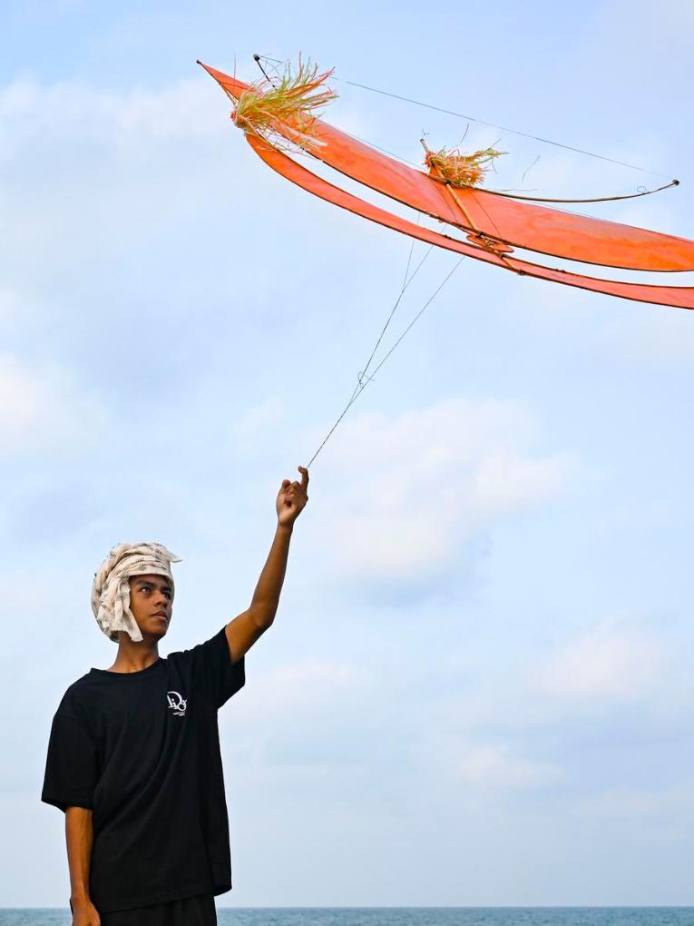 Mohd Azeimi Muhd Noor (R) and his son Denie Danial bin Muhd Azeimi prepare to fly a kite by the shore near Kota Bharu in Kelantan, Malaysia, on March 28, 2025.Mohd Azeimi Muhd Noor (R) and his son Denie Danial bin Muhd Azeimi fly a kite by the shore near Kota Bharu in Kelantan, Malaysia, on March 28, 2025.A moon kite is flied by Mohd Azeimi Muhd Noor and his son Denie Danial bin Muhd Azeimi by the shore near Kota Bharu in Kelantan, Malaysia, on March 28, 2025.