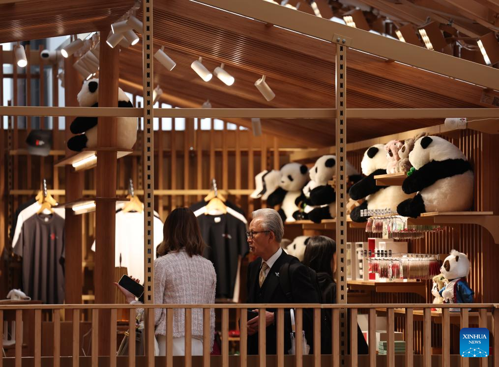 People visit a souvenir shop of the China Pavilion at the Osaka Expo in Osaka, Japan, April 13, 2025. The China Pavilion officially opened on Sunday at the Osaka Expo, with an opening ceremony held in front of the pavilion's main building, which is designed to resemble a traditional Chinese scroll.