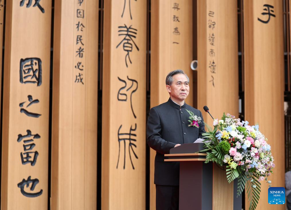 Chinese Ambassador to Japan Wu Jianghao addresses the opening ceremony of the China Pavilion at the Osaka Expo in Osaka, Japan, April 13, 2025. The China Pavilion officially opened on Sunday at the Osaka Expo, with an opening ceremony held in front of the pavilion's main building, which is designed to resemble a traditional Chinese scroll.
