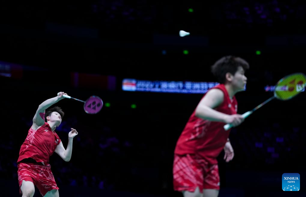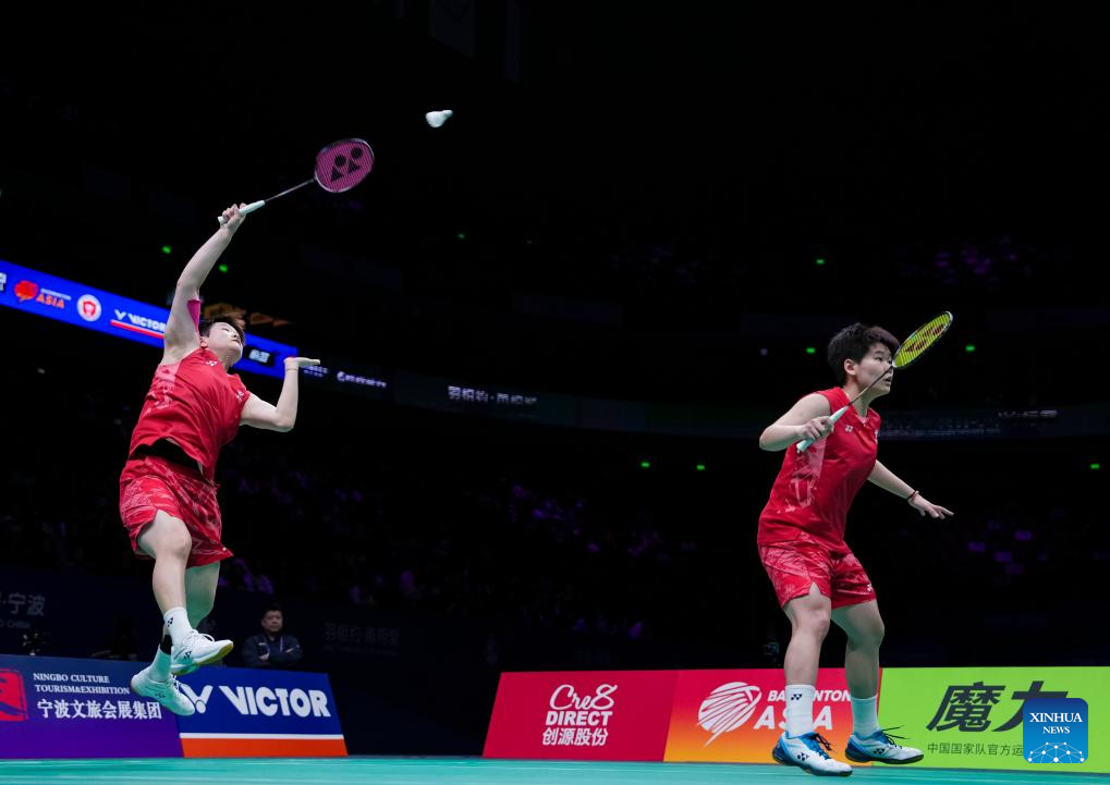 Liu Shengshu (L)/Tan Ning of China compete during the women's doubles final against Matsuyama Nami/Shida Chiharu of Japan at Badminton Asia Championships 2025 in Ningbo, east China's Zhejiang Province, April 13, 2025. (Xinhua/Sun Fei)