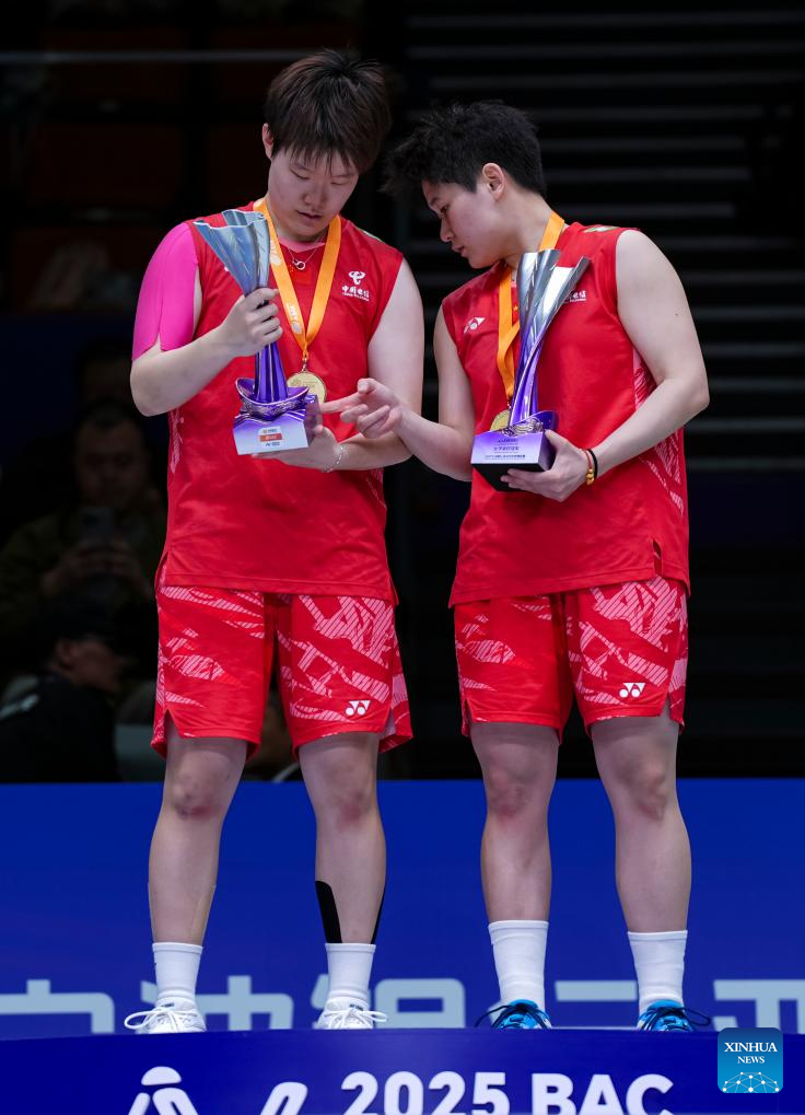 Gold medalists Liu Shengshu (L)/Tan Ning of China react during the awarding ceremony for the women's doubles event at Badminton Asia Championships 2025 in Ningbo, east China's Zhejiang Province, April 13, 2025. (Xinhua/Sun Fei)