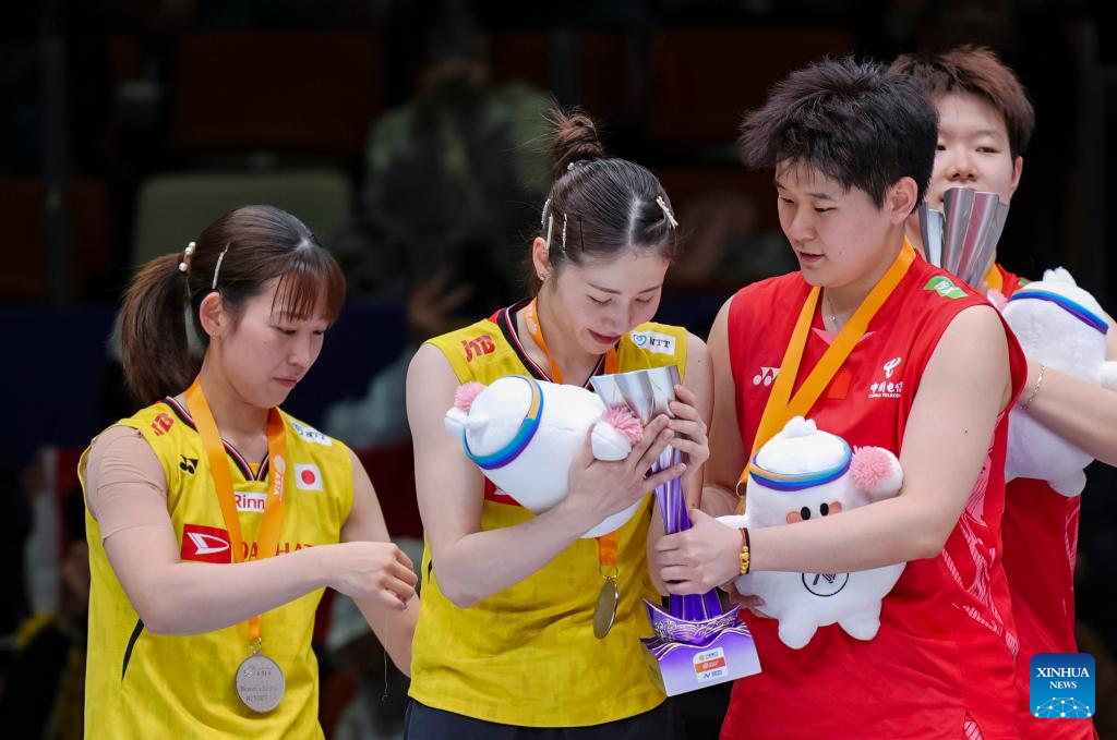 Gold medalists Liu Shengshu (1st R)/Tan Ning (2nd R) of China and silver medalists Matsuyama Nami (1st L)/Shida Chiharu of Japan attend the awarding ceremony for the women's doubles event at Badminton Asia Championships 2025 in Ningbo, east China's Zhejiang Province, April 13, 2025. (Xinhua/Sun Fei)