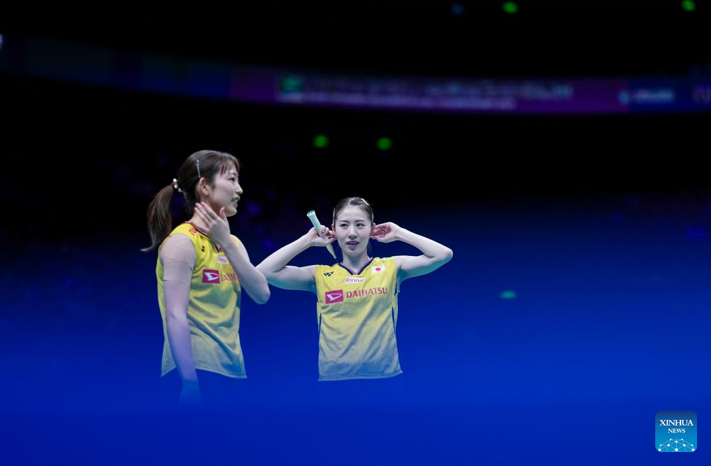 Matsuyama Nami/Shida Chiharu (R) of Japan react during the women's doubles final against Liu Shengshu/Tan Ning of China at Badminton Asia Championships 2025 in Ningbo, east China's Zhejiang Province, April 13, 2025. (Xinhua/Sun Fei)