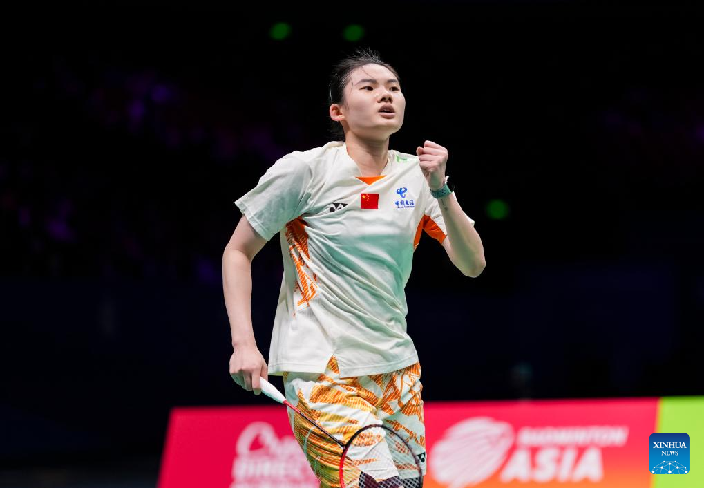 Han Yue of China celebrates scoring during the women's singles final against Chen Yufei of China at Badminton Asia Championships 2025 in Ningbo, east China's Zhejiang Province, April 13, 2025. (Xinhua/Sun Fei)