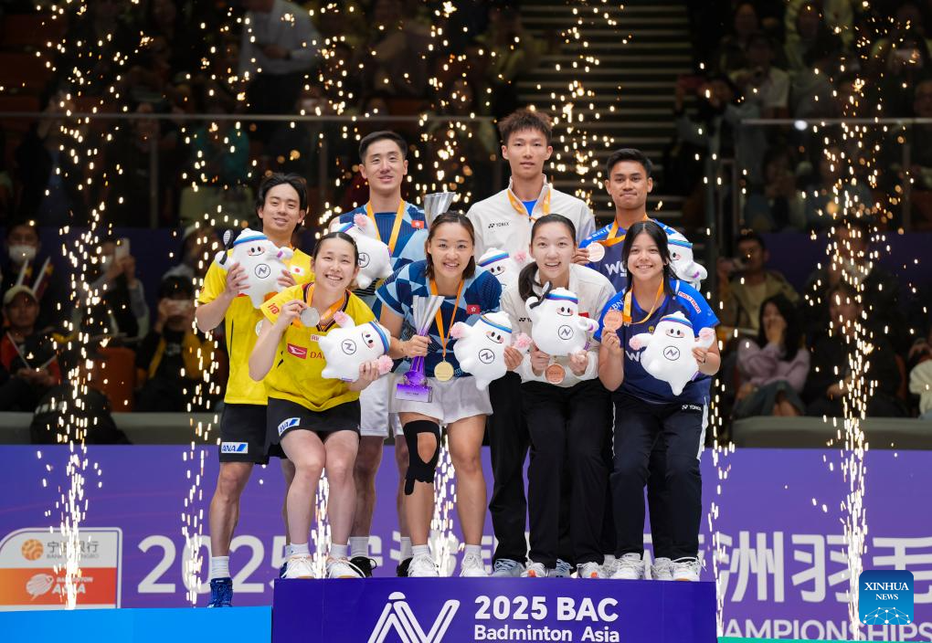 Gold medalists Tang Chun Man (3rd L)/Tse Ying Suet (4th L) of China's Hong Kong, silver medalists Midorikawa Hiroki (1st L)/Saito Natsu (2nd L) of Japan, bronze medalists Jiang Zhenbang (4th R)/Wei Yaxin (3rd R) of China and Jafar Hidayatullah (2nd R)/Felisha Alberta Nathaniel Pasaribu of Indonesia attend the awarding ceremony for the mixed doubles event at Badminton Asia Championships 2025 in Ningbo, east China's Zhejiang Province, April 13, 2025. (Xinhua/Sun Fei)