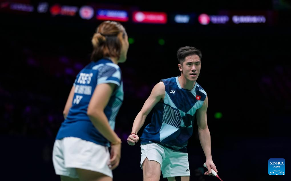 Tang Chun Man (R)/Tse Ying Suet of China's Hong Kong compete during the mixed doubles final match against Midorikawa Hiroki/Saito Natsu of Japan at Badminton Asia Championships 2025 in Ningbo, east China's Zhejiang Province, April 13, 2025. (Xinhua/Sun Fei)