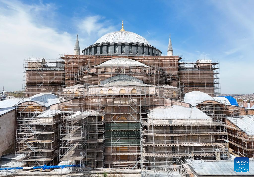 ISTANBUL, April 14 (Xinhua) -- Türkiye on Monday started the first-ever comprehensive restoration work on the main dome of Hagia Sophia, one of the most important historical sites in Istanbul.
