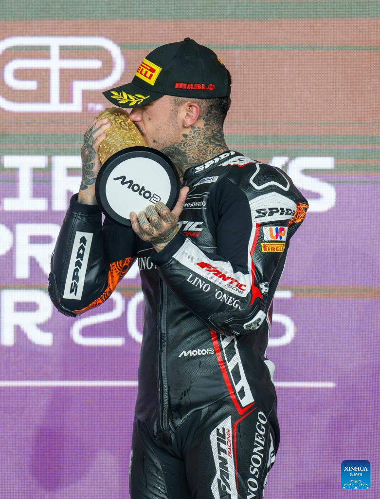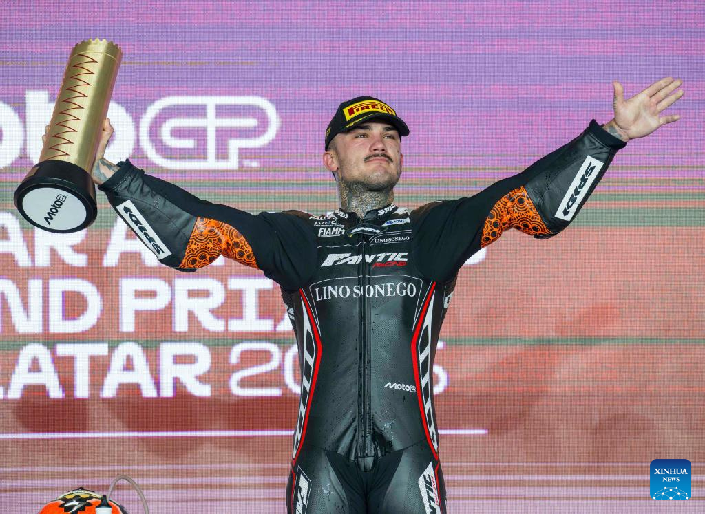 Spanish Moto2 rider Aron Canet of Fantic Racing Lino Sonego celebrates on the podium after winning the Moto2 race of MotoGP Grand Prix Qatar 2025 in Lusail Circuit in Doha, Qatar, on April 13, 2025. (Photo by Nikku/Xinhua)