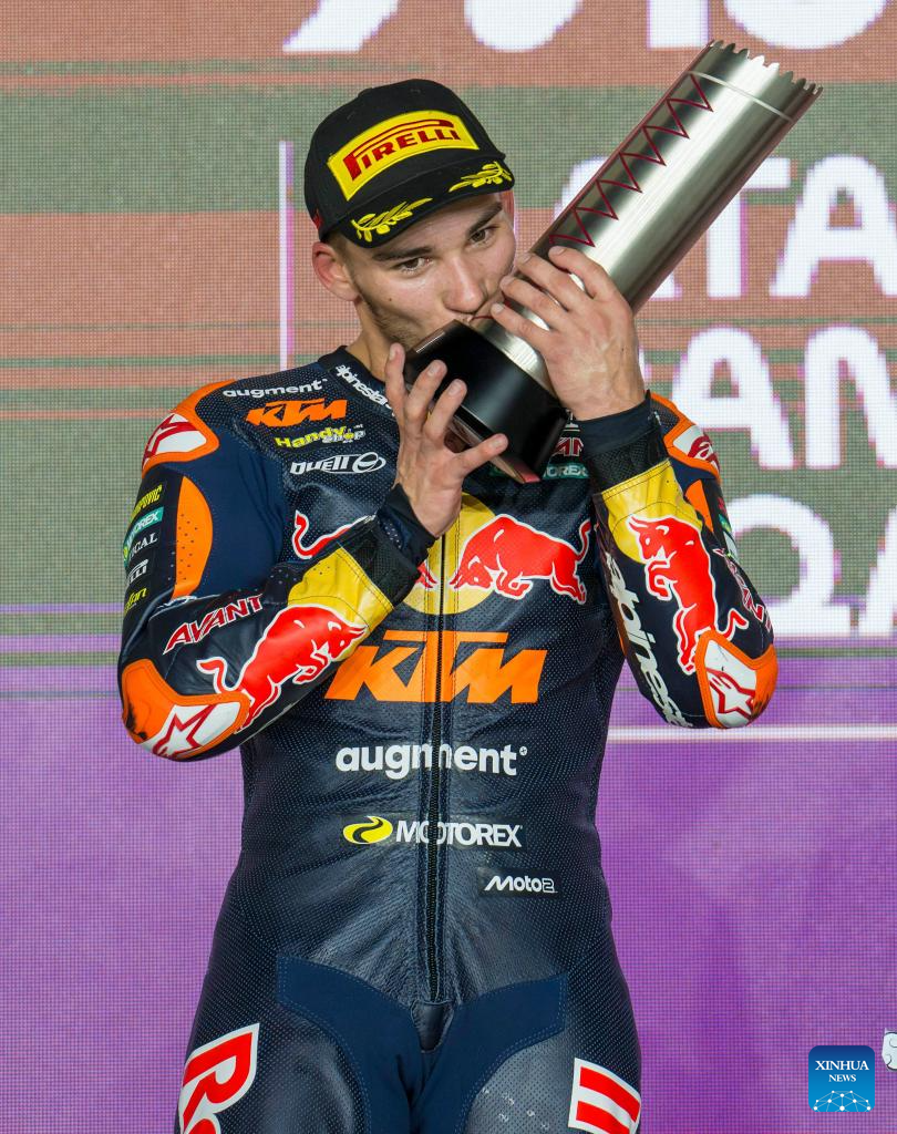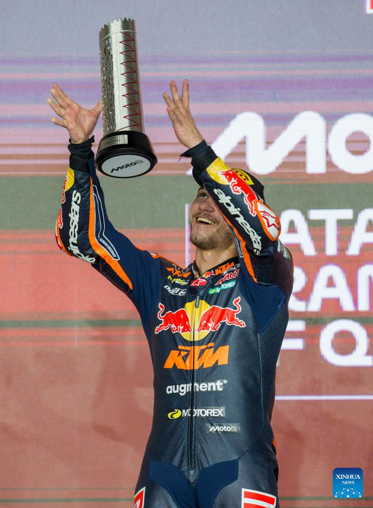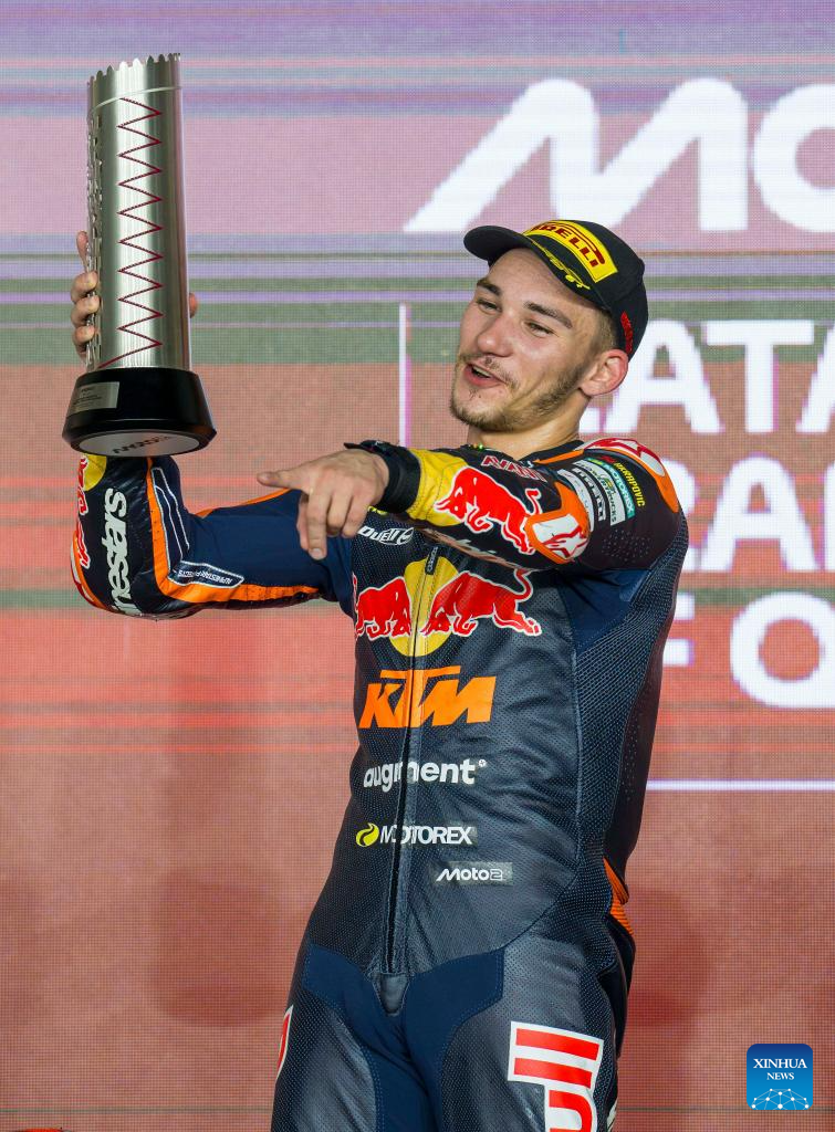 Turkish Moto2 rider Deniz Oncu of Red Bull KTM Ajo celebrates on the podium after winning the second place in the Moto2 race of MotoGP Grand Prix Qatar 2025 in Lusail Circuit in Doha, Qatar, on April 13, 2025. (Photo by Nikku/Xinhua)