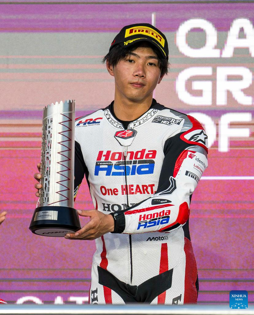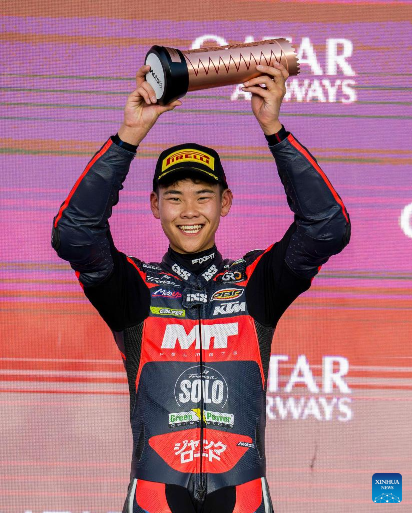 Japanese Moto3 rider Taiyo Furusato of Honda Team Asia celebrates on the podium after winning the second place in the Moto3 race of MotoGP Grand Prix Qatar 2025 in Lusail Circuit in Doha, Qatar, on April 13, 2025. (Photo by Nikku/Xinhua)