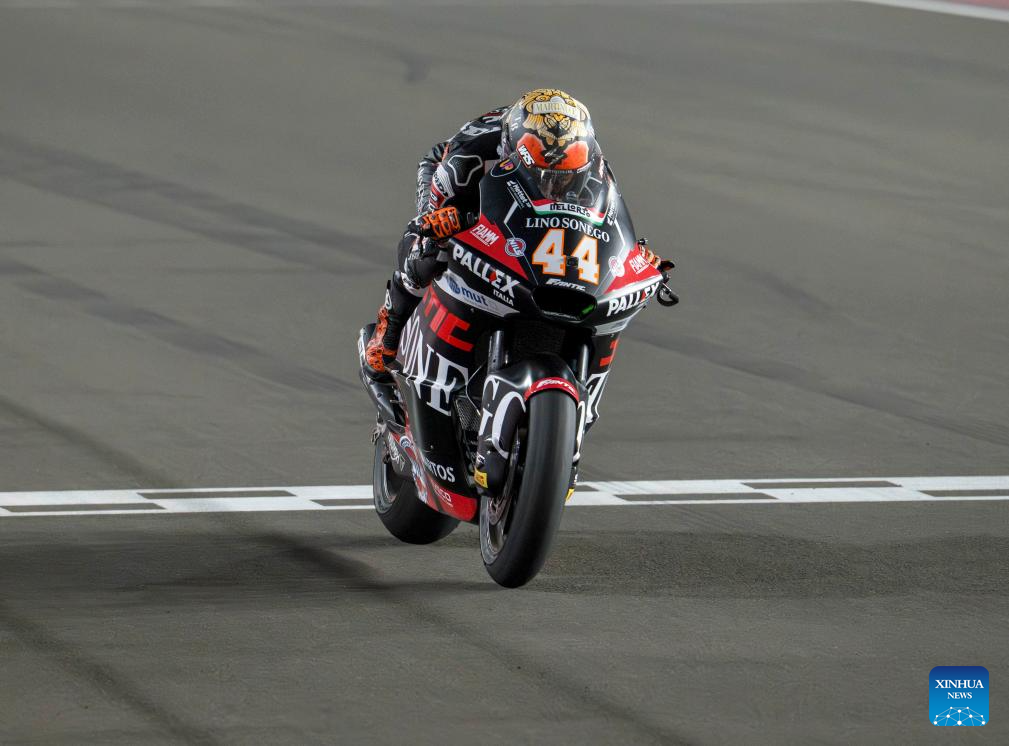 Spanish Moto2 rider Aron Canet of Fantic Racing Lino Sonego on his way to cross the finish line at the end of the moto2 race race of MotoGP Grand Prix Qatar 2025 in Lusail Circuit in Doha, Qatar, on April 13, 2025. (Photo by Nikku/Xinhua)